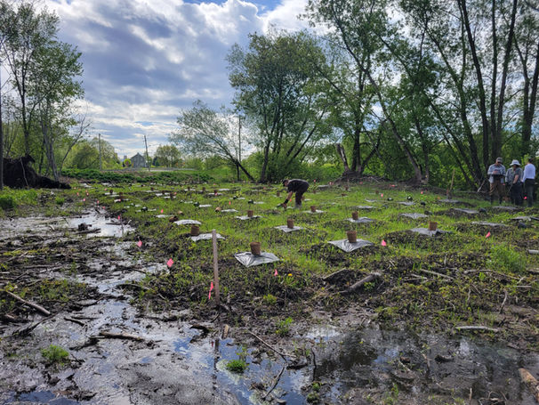 Le projet repose sur la mise en place d’un dispositif expérimental dans un marécage arborescent récemment restauré. Deux espèces d’arbres ont été plantées au printemps 2025 dans des zones présentant deux types de microtopographie : des buttes et creux versus des surfaces planes. La survie et la croissance des arbres sont suivies à l’échelle de chaque arbre, tandis que la composition végétale environnante est relevée pour évaluer la diversité et la compétition. Des mesures environnementales (p. ex. humidité du sol, position topographique, etc.) sont également recueillies afin d’interpréter les résultats en lien avec les conditions locales.